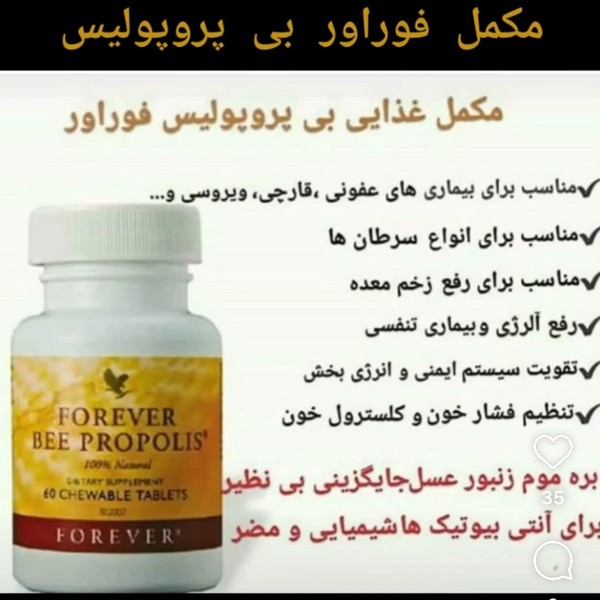 مکمل فوراور بی پروپولیس Forever Bee Propolis آنتی بیوتیک طبیعی و جلوگیری از رشد میکروب ها، قارچ ها و ویروس ها مقابله با سلول های سرطانی @vitamin.zakiya یکی از خواص جالب توجه آن کنترل و مقابله با بیماری ایدز است موثر در بهبود آلرژی, آسمژیت, برونشیت, عفونت های مجاری تنفسی کمک به بهبود بیماری های مجاری شنوایی و گوش @vitamin.zakiya مفید برای بهبود کیست موثر در بهبود بیماری هپاتیت خواص ضد پوسیدگی دندان کمک به بهود آسیبهای مفصلی و آرتروز بهبود دهندهی مشکلات سلامتی دهان و لثه تنظیم کنندهی فشار خون محتوی: ۶۰ قرص روش مصرف: ۲ بار در روز، هر بار ١ عدد، اول کاملاً بجوید و سپس قورت دهید.