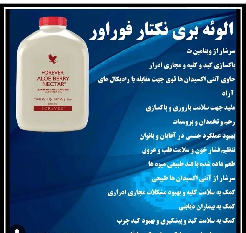 نوشیدنی بری نکتار فوراور | Forever Aloe Berry Nectar خواص بی نظیر۰۰۰ کمک به هضم غذا بهبود فعالیت سیستم گوارشی بدن سرشار از ویتامین ها و آنتی اکسیدان های طبیعی کمک به بهبود سردرد و میگرن کاهش قند خون و فشار خون خیلی پایین بهبود کم کاری تیروئید کمک به درمان یبوست، التهاب مثانه، صرع و سنگ صفرا مناسب جهت مصرف افراد از تمام گروه های سنی سم زدایی و پاکسازی کبد تقویت پوست و مو بهبود کبد چرب کنترل اشتها کاهش سایز شکم و پهلو پاکسازی و سلامت پروستات و رحم و تخمدان بهبود نازایی و ناباروری پیشگیری و بهبود عفونت زنانه و کیست و فیبروم و میوم # سازی_کبد#فوراور # فوراورآمریکا #سلامتی#نوشیدنی#فوراور تهران مشاوره رایگان
