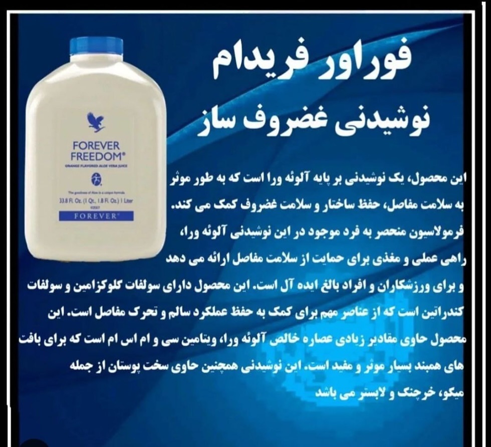 این محصول، یک نوشیدنی بر پایه آلوئه ورا است که به طور موثر به سلامت مفاصل، حفظ ساختار و سلامت غضروف کمک می کند. فرمولاسیون منحصر به فرد موجود در این نوشیدنی آلوئه ورا، راهی عملی و مغذی برای حمایت از سلامت مفاصل ارائه می دهد و برای ورزشکاران و افراد بالغ ایده آل است محصول دارای سولفات گلوکزامین و سولفات کندراتین است که از عناصر مهم برای کمک به حفظ عملکرد سالم و تحرک مفاصل است محصول حاوی مقادیر زیادی عصاره خالص آلوئه ورا، ویتامین سی و ام اس ام است که برای بافت های همبند بسیار موثر و مفید است نوشیدنی همچنین حاوی سخت پوستان از جمله میگو، خرچنگ و لابستر می باشد موارد مصرف نوشیدنی فوراور فریدام: سلامتی استخوانها و مفاصل کمک به بهبود بیماری های مفصلی بهبود و کاهش درد در بیماری های استخوانی از قبیل آرتروز، روماتیسم، دیسک کمر و بهبود و سلامت کلی بدن و استحکام ساختاری بدن محتوی: ۱ لیتر #فریدام_نوشیدنی #فوراورلیوینگ_تهران درد#استخوان#زانو_درد