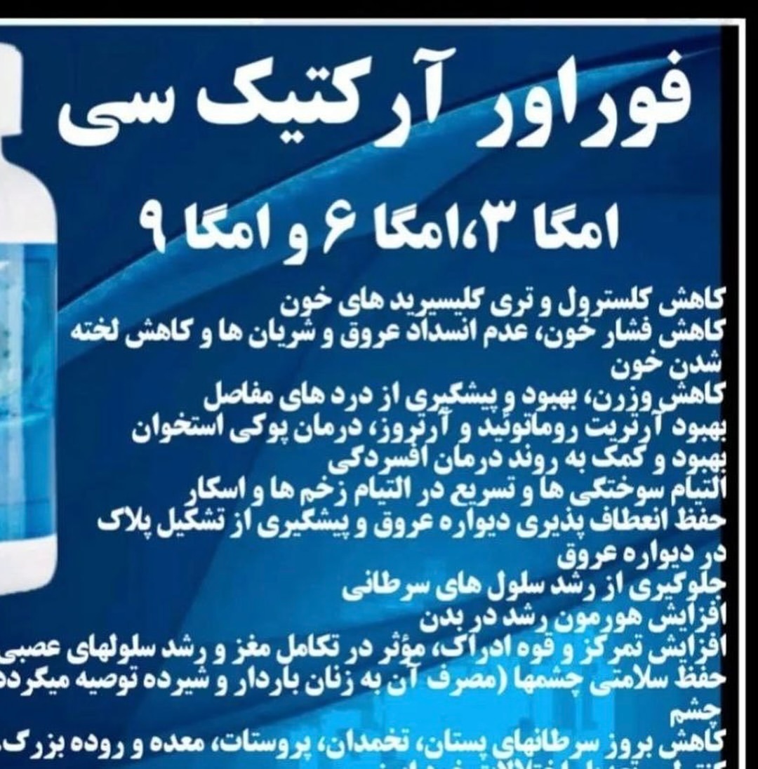 Forever Arctic sea فوراور آرکتیک سى (امگا امگا 6 و امگا 9) کاهش کلسترول و تری گلیسیرید های خون کاهش فشار خون، عدم انسداد عروق و شریان ها و کاهش لخته شدن خون کاهش وزرن، بهبود و پیشگیری از درد های مفاصل بهبود آرتریت روماتوئید و آرتروز، درمان پوکی استخوان بهبود و کمک به روند درمان افسردگی التیام سوختگی ها و تسریع در التیام زخم ها و اسکار حفظ انعطاف پذیری دیواره عروق و پیشگیری از تشکیل پلاک در دیواره عروق جلوگیری از رشد سلول های سرطانی افزایش هورمون رشد در بدن افزایش تمرکز و قوه ادراک، مؤثر در تکامل مغز و رشد سلولهای عصبی حفظ سلامتی چشمها (مصرف آن به زنان باردار و شیرده توصیه میگردد) و درمان خشکی چشم کاهش بروز سرطانهای پستان، تخمدان، پروستات، معده و روده بزرگ. کنترل و تعدیل اختلالات خود ایمنی پیشگیری و کمک به بهبود بیماری هایی چون آلزایمر، آسم، اختلال کم توجهی، بیش فعالی، اختلال دو قطبی، اختلالات تغذیه ای، اگزما، میگرن، پسوریازیس و آکنه. محتوی: 120 کپسول ژلاتینی روش مصرف: روزانه 2 الی عده پس از غذا، هر بار 2 عدد. لطفا با و پست ها از ما حمایت کن سیو کن شاید خواستی یه روز این محصول رو بخری منتظر پست های بعدیمون باش. #امگافوراور # #امگافوراور#کلسترول#ارگانیک امگا#اُمگا_فوراور افسردگی