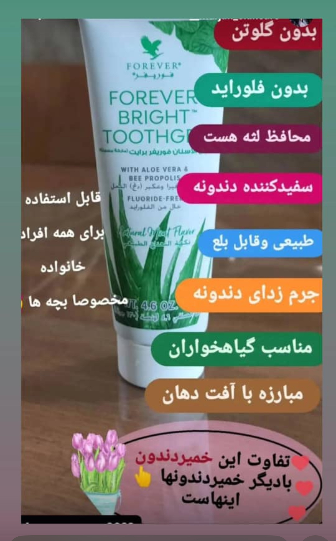 خمیر دندان فوراور برای تمام اعضای خانواده فرموله شده است و بهترین مواد اولیه درآن بکار رفته است و علاوه بر ماده اصلی آن که همان ژل پایدار آلوئه ورا است حاوی بی پروپولیس یا آنتی بیوتیک زنبور عسل نیز می باشد. وجود این دو ترکیب ضد باکتری در آن موجب خواص ضد پلاک و جرم شده، دهان را خوشبو می کند و به علت ضد التهاب بودن برای لثه ها و بافت درونی نازک شده دندانها مفید است. در خونریزی های لثه و زخم های دهانی بکار می رود و هنگامی که مسواک زدن موجب درد می شود می توان آن را به تنهایی استفاده کرد.علاوه بر آن این خمیر دندان فاقد فلوراید که یک ماده سمی میباشد .از این رو کف آن قابل قورت دادن می باشد